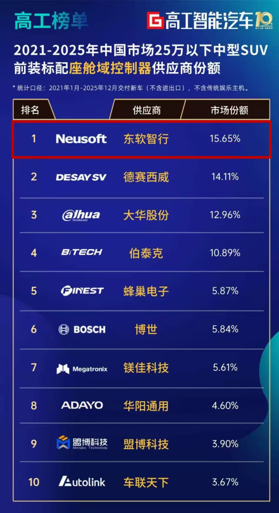 近日,高工智能汽车研究院发布《2021-2025年中国市场25万以下中型SUV前装标配座舱域控制器供应商份额榜单》,东软智行以15.65%的市场份额高居榜首。
