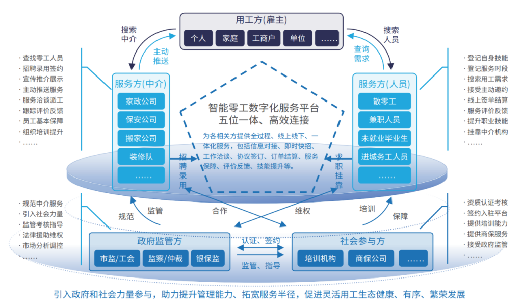 智能零工以数字技术构建零工全链条服务,覆盖找活、保障、维权、培训功能,推动零工服务数智化、规范化发展。