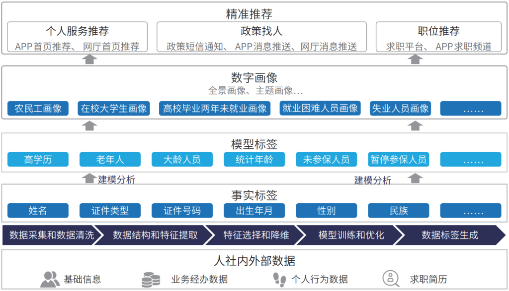 采集社保、就业、人才、维权等多方面数据,对其进行清洗和整合,保证数据的质量和准确性。数据清洗后,对数据进行结构化处理,同时从数据中提取出与标签相关的特征,特征可以包括服务对象的基本信息、业务行为、社会行为等方面的数据。在特征提取后,为了提高数据处理的效率和准确性,需要对特征进行选择和降维,使用算法和模型对数据进行训练和优化,根据模型输出的结果和设定的规则,生成相应的数据标签。根据不同的应用场景需求,为个人和群体构建各类画像。