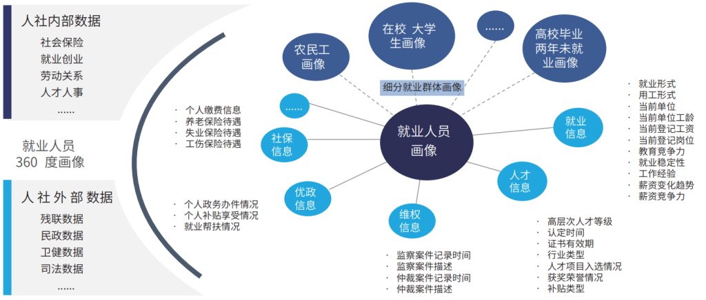 就业人员画像系统,通过汇聚社保、就业、人才、维权等多方面数据,构建人力资源行业个人、企业、机构、产业等数字资产,为构建人力资源高质量数据集提供丰富的数据资源基础。