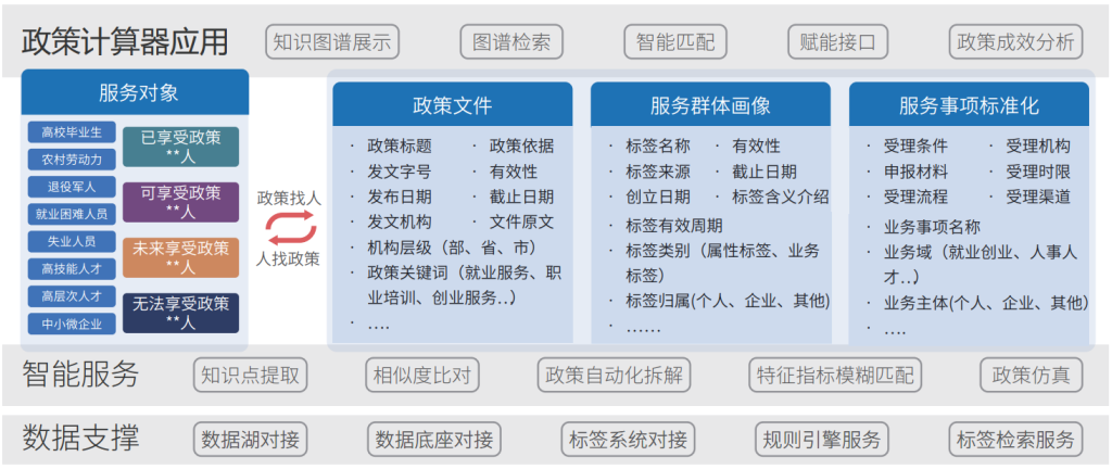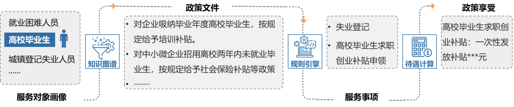 系统基于知识图谱解析政策条款,通过智能拆解功能将政策拆解为“条件-程序-途径-标准”结构化数据,结合服务对象库中的对象分类(如高校毕业生、就业困难群体等),自动提取标签特征定义,形成数字化政策生态体系。