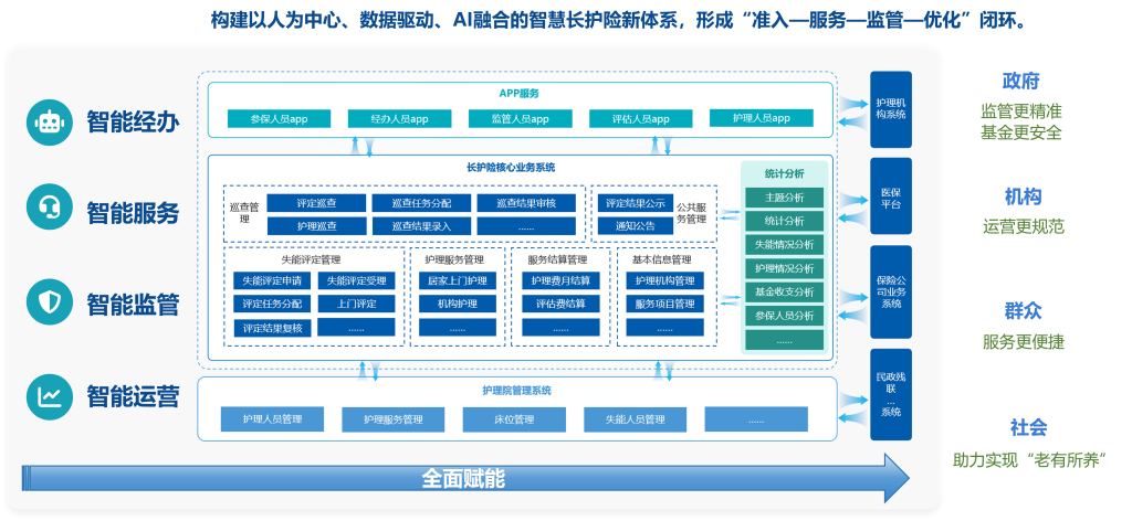 医保长期护理保险系统严格遵循国家及各省市医保平台架构与标准建设,深度融入国家医保信息平台体系,实现与基本医疗保险系统互联互通、数据共享、业务协同。系统以参保人为中心,依托大数据、人工智能、物联网、自然语言处理等现代信息技术,打造核心经办端、移动服务端、照护机构端、智能监管端四端联动的全流程数智化经办管理体系,覆盖长护险参保、申请、失能评估、待遇核定、护理服务、费用结算、基金监管、机构管理等全业务环节,实现业务流程自动化、管理精细化、服务便捷化、监管智能化。系统兼顾国家集中管理要求与各地市差异化经办需求,具备良好的可扩展性、兼容性和定制化能力,为全省乃至全国长护险信息化建设提供可复制、可推广的解决方案。