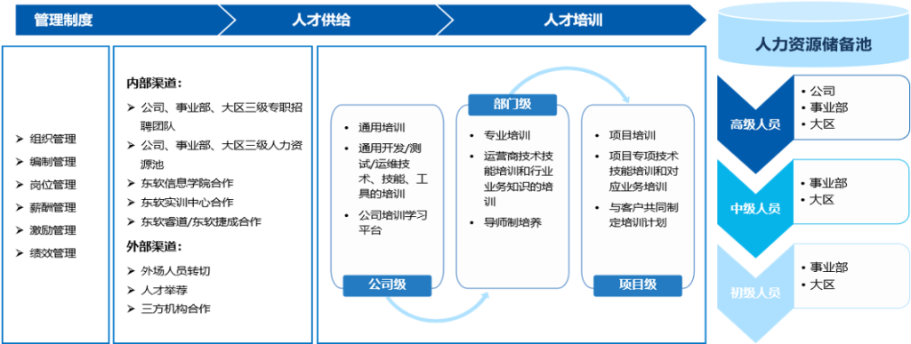 打造高效协同的专业服务团队,构建“制度保障 – 人才供给 – 分层培养 – 储备池支撑” 的全链路人才发展体系,为项目实施提供坚实人力保障。