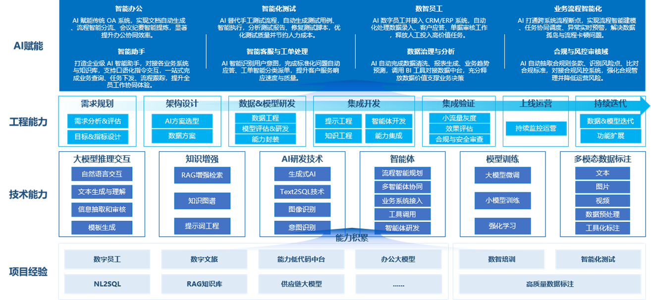 助力企业实现办公协同提效、测试流程自动化、员工高价值任务释放、跨系统流程断点打通;依托从需求规划、架构设计到持续迭代的全链路工程能力,融合大模型推理交互、知识增强、AI 研发、智能体开发、模型训练、多模态数据标注等核心技术,拥有磐匠数字员工、数字文旅、能力低代码中台、办公大模型、NL2SQL、RAG 知识库等成熟项目实践经验,可为企业提供从 AI 方案落地到长期运营迭代的一体化技术服务,全面释放数据与智能价值,赋能业务数字化转型与智能化升级。