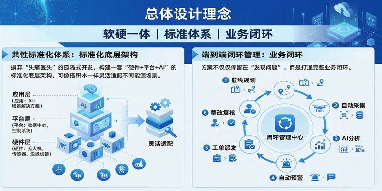 构建 “无人机终端 + 全自动机巢 + 平台系统” 的标准化软硬一体架构,支持网格化无人值守部署,打通航线自动规划、多源数据智能采集、AI 缺陷识别、自动预警、工单派发、整改复核的端到端业务闭环,形成标准化巡检 SOP,可替代人工高危作业,实现 7×24 小时常态化智能巡检。