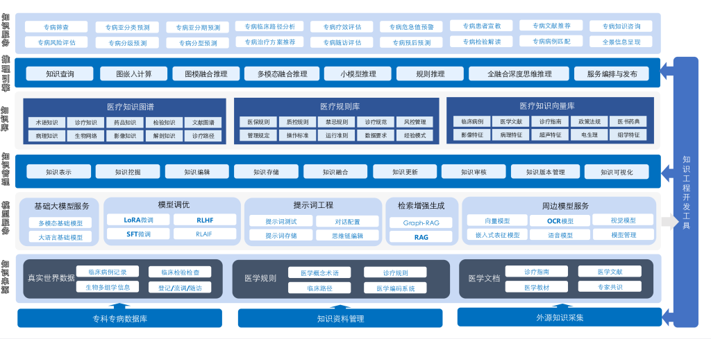 专注于医疗知识的汇聚、挖掘、构建、表示与计算。利用从临床指南、专家共识、诊疗规范、治疗路径、医学文献等知识来源中挖掘医疗知识,形成医学知识图谱和规则库为主要形式的医学知识库。基于知识查询与推理,提供临床辅助决策、病历内涵质控、医嘱合理性预警等知识服务,支持患者诊疗数据的场景化可配置信息呈现。