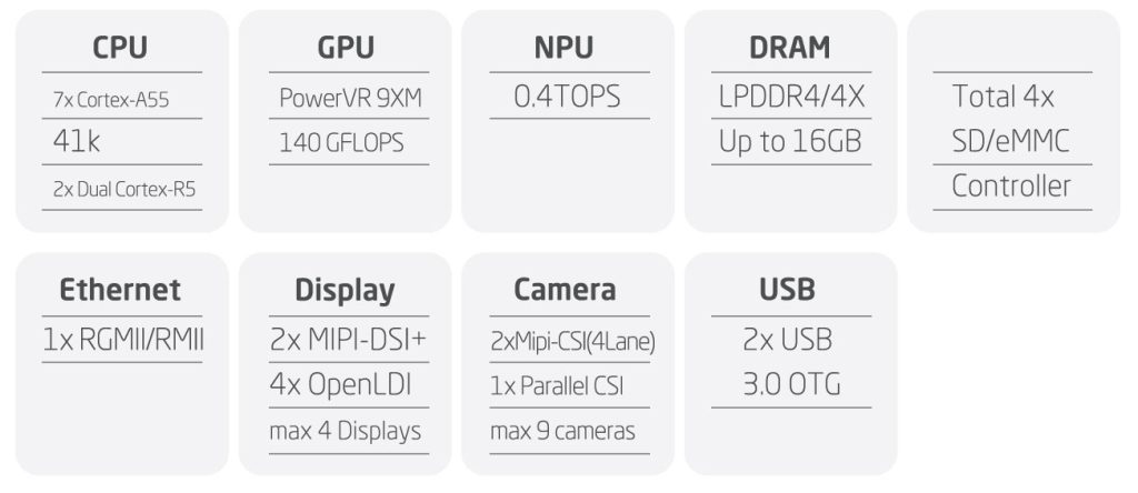 - 支持4路显示画面渲染和输出,8路摄像头(DMS,OMS,OVR, RVC/AVM等)输出