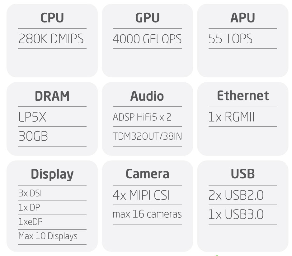 - Al大模型引擎:集成专用APU加速模块,支持十亿参数级Al模型本地化部署,从智能语音助手到场景化情感交互,让每辆汽车都能进化成「有温度的出行伙伴」。