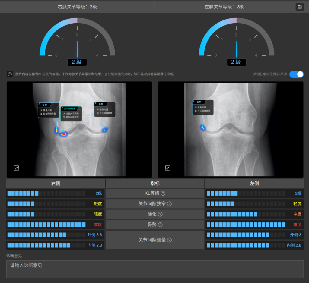- 可视化辅助增强判读信心:2.0版本新增的关键征象可视化功能,为核心的分级提供了直观的“证据链”。系统可对判定为骨赘、狭窄的区域进行智能定位与高亮,使医生能一键比对AI的“所见”与自身判读,极大地提升了对于KL分级等核心结果的可信度与复核效率,让AI不仅是“算得准”,更是“看得清”、“讲得明”。