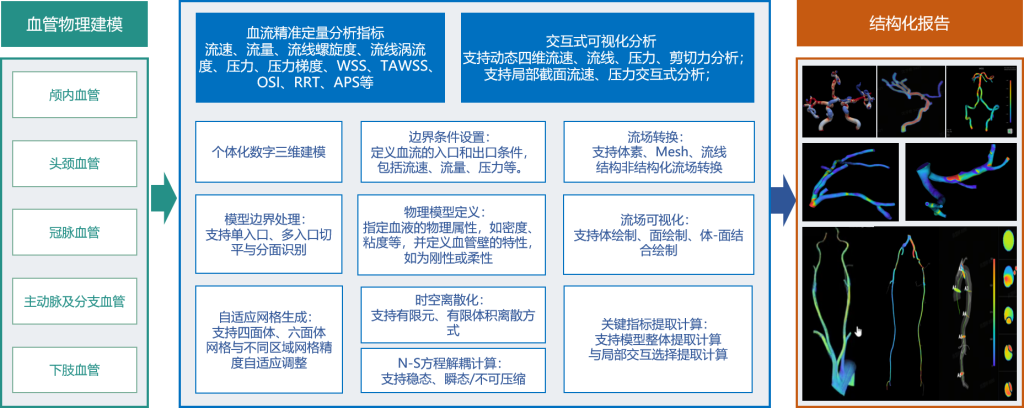 Vasis Flow 通用血流分析系统使用 CT、CTA、MRA、MRI 等医学影像数据,利用 AI+CFD 技术,以无创方式在空间、时间四个维度计算血管内的血流动力学指标,包括血流量、流速、血压、剪切力以及它们之间的相互关系的指标,用以分析血流功能特征,评估血管健康状态,判断手术时机,评估手术的效果等。Vasis Flow 能够计算颅内、头颈、冠脉、肺、主动脉及分支、下肢等全身血管的血流动力学指标,为医生提供更全面、详细的血流参数,帮助医生更精准地做出诊断决策、制定更有效的治疗方案。