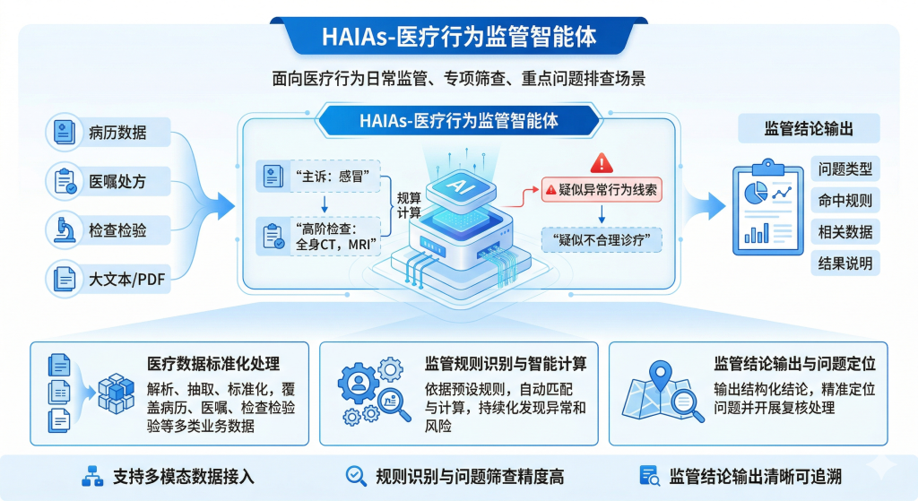 医疗行为监管智能体面向医疗行为日常监管、专项筛查和重点问题排查等场景,依托大模型理解能力、医疗知识能力与规则计算能力,对病历、医嘱、检查检验等多类业务数据进行智能分析、规则识别与监管结论输出。产品可辅助监管人员高效发现诊疗过程中的异常问题、风险线索和不规范行为,提升问题筛查效率、结果研判能力与监管执行效果,促进医疗行为更加规范开展。