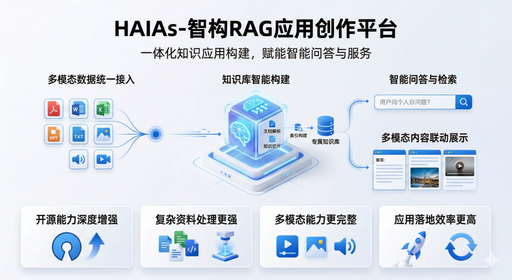 HAIAs-智构RAG应用创作平台面向各类知识应用构建需求,集多模态数据接入、知识库构建、检索增强生成、智能体创作与应用发布等能力于一体。平台在成熟开源产品能力基础上进行深度工程化优化,重点增强文档解析、知识切片、索引构建与检索召回等关键环节,支持文本、表格、图片、音视频等多类型数据统一处理,帮助用户将分散知识资源快速转化为可调用、可复用、可持续更新的知识资产,加快智能问答与知识服务应用落地。