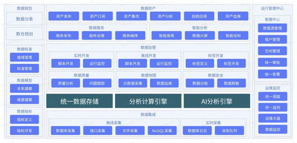 数盈数据资源管理平台专注数据领域,是集数据规划、采集、治理、服务及资产管理于一体的全生命周期处理工具。通过数仓规划、数据标准、数据模型及数据指标管理为数据管理绘制清晰蓝图,避免资源浪费,促进数据与业务深度融合,提升数据管理效能与决策支撑力。借助离线数据采集和实时数据采集,从各类异构数据源中精准、完整且及时地汇聚原始数据,形成全域数据中心,为下游数据应用提供全面、真实的数据支撑。通过数据质量分析、比对、安全管理,构建完善的数据治理体系,全方位管控数据质量、数据安全,提升数据可用性与可靠性。借助离线开发、实时开发及标签开发,从海量数据中萃取精华,为业务创新与决策科学化注入强大动力。通过服务注册、发布、编排、统一管控,让数据安全、高效的流通起来,加速业务流程,增进跨部门协作,拓展数据应用边界。借助数据资产、数据血缘、关联关系与自助查询,让数据触手可及,提升数据战略地位,挖掘数据经济价值,为组织创造多元收益与竞争优势。