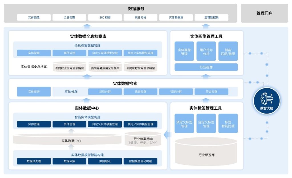 将服务提供者、服务使用者、服务监管者等对象在数据空间中的动态数字孪生定义为实体,以行业标准与业务场景深度融合为导向,以各类实体为关键连接点,将分散数据整合为实体数据集。依托专业化工具矩阵与预定义数据模型,对跨领域、多来源数据资源开展全流程系统化加工,可快速构建以实体为核心的,涵盖实体标签、画像、全息档案、监管专用数据集等在内的高质量数据服务体系。