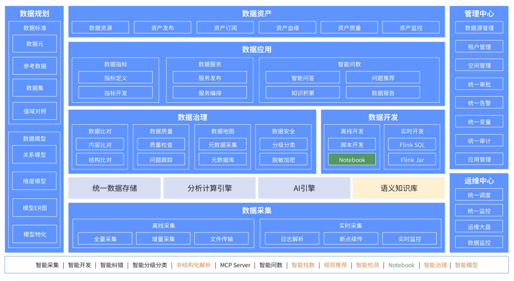 数盈数据资源管理平台专注数据领域,是集数据规划、采集、治理、服务及资产管理于一体的全生命周期处理工具。通过数仓规划、数据标准、数据模型及数据指标管理为数据管理绘制清晰蓝图,避免资源浪费,促进数据与业务深度融合,提升数据管理效能与决策支撑力。借助离线数据采集和实时数据采集,从各类异构数据源中精准、完整且及时地汇聚原始数据,形成全域数据中心,为下游数据应用提供全面、真实的数据支撑。通过数据质量分析、比对、安全管理,构建完善的数据治理体系,全方位管控数据质量、数据安全,提升数据可用性与可靠性。借助离线开发、实时开发及标签开发,从海量数据中萃取精华,为业务创新与决策科学化注入强大动力。通过服务注册、发布、编排、统一管控,让数据安全、高效的流通起来,加速业务流程,增进跨部门协作,拓展数据应用边界。借助数据资产、数据血缘、关联关系与自助查询,让数据触手可及,提升数据战略地位,挖掘数据经济价值,为组织创造多元收益与竞争优势。
