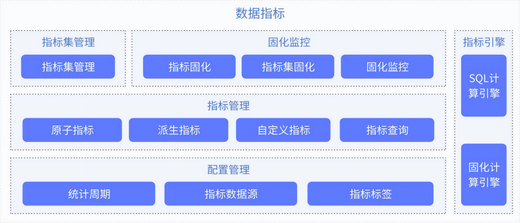 数据指标产品作为数据平台的核心组成,以“出发于业务、服务于业务”为目标,构建供业务使用的指标数据标准体系,为数据平台的各应用能力中心提供基础数据支撑。数据指标系统是对核心业务数据的统计分析的产品化解决方案。为了各部门使用统一的标准去衡量业务,便于充分理解数据含义,并基于各部门的数据统计及需求分析,实现“多源一数、一数多用”,在业务指标看板中对关心的指标进行统计、分析以及了解具体的指标情况,更清晰的了解数据之间的关系或者发展趋势。建设数据指标系统,能够快速查找并了解指标详情定义,保证统计结果的一致性、规范性和专业性。