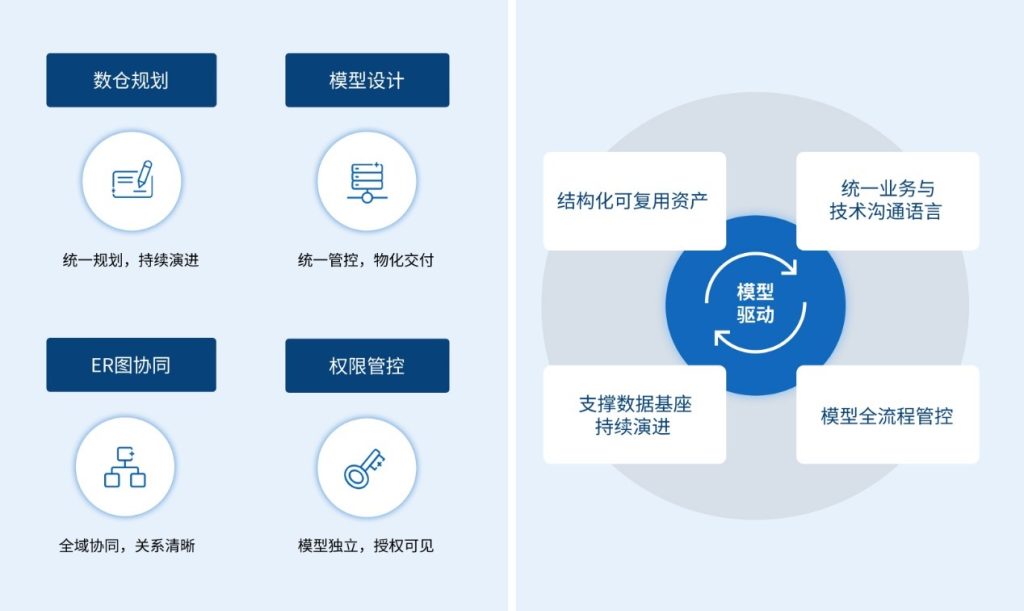 支持模型与数据标准直接引用、自动生成模型表关联关系及模型资产化管理,实现模型与标准的深度融合,提升模型规范性与复用性。
