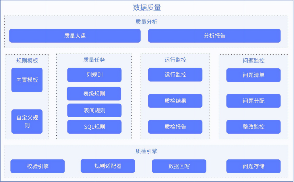 数据质量产品主要通过质量规则、质检任务、问题数据跟踪及质量报告等分析和管理能力,及时发现数据中存在的违反数据准确性、一致性、完整性、及时性、唯一性及有效性方面的问题,通过问题跟踪及质量报告进行迭代式改进,从而达到提高数据质量的目标。
