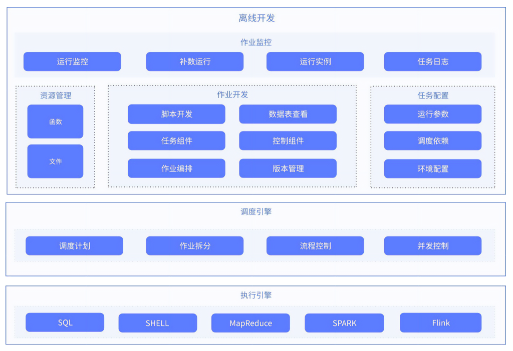 离线数据开发产品是一款分布式、易扩展的一站式数据处理作业开发与调度平台,提供包含资源管理、脚本开发、作业开发、任务编排、统一调度和运维监控等能力。为数据开发人员提供在线脚本开发编辑器,帮助用户针对异构数据存储进行统一的数据处理逻辑,支持实现用户自行组合 SQL、 MR、Shell 等多种类型任务进行作业流程编排,支持对接 CDH、HDP、EMR、MRS 等多种大数据引擎底座,致力于解决数据处理流程中错综复杂的依赖关系,帮助用户解决大数据开发运维困难、门槛高的问题,缩短开发周期、提升开发效率。
