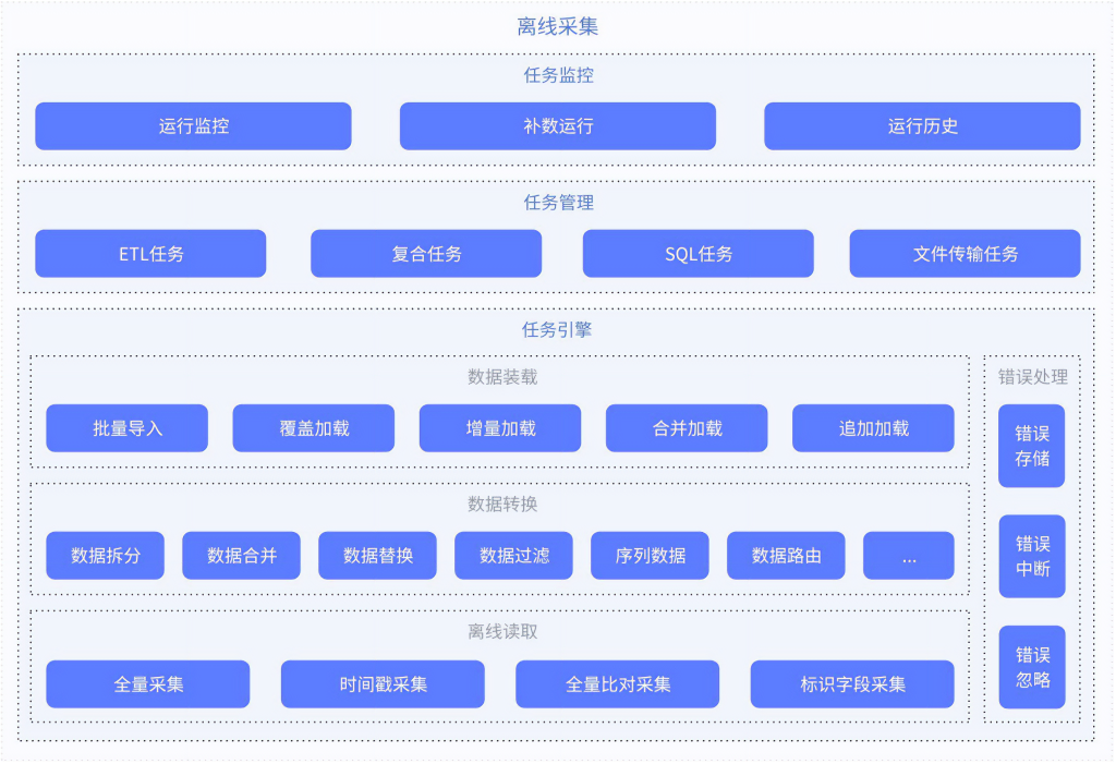 数据分散存储在不同的地方,难以进行统一管理和分析。离线采集提供了强大的 ETL 功能,包括数据抽取、转换和加载过程,使得来自多个源头的数据可以被集中处理并导入到一个中心数据库或数据仓库中,从而简化了数据管理流程。